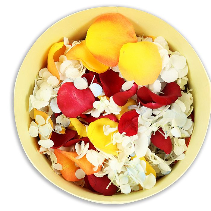 Introducing our Vibrant Seasonal Petal Symphony, a unique bouquet that harmonizes Hydrangea, Rose, and Chrysanthemum petals in a stunning display of color and elegance.