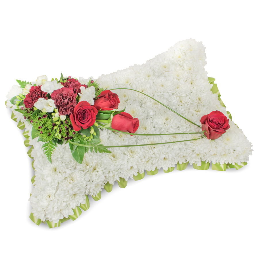 Show your support and affection with this elegantly crafted floral arrangement, designed to convey deep sympathy. The bouquet blends the calming hues of white chrysanthemums with the passionate allure of red roses, graceful white freesias, and rich dark red carnations, all enhanced by accents of dianthus and bear grass. Every bloom is meticulously hand-picked to ensure stunning freshness and vibrant color.