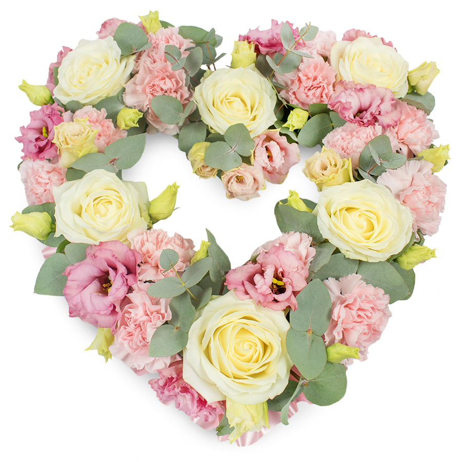 Show your appreciation with our charming open heart floral arrangement, thoughtfully designed to reflect love and gratitude. This elegant bouquet features white roses, pink carnations, delicate pink lisianthus, and aromatic eucalyptus leaves, creating a unique and captivating display.